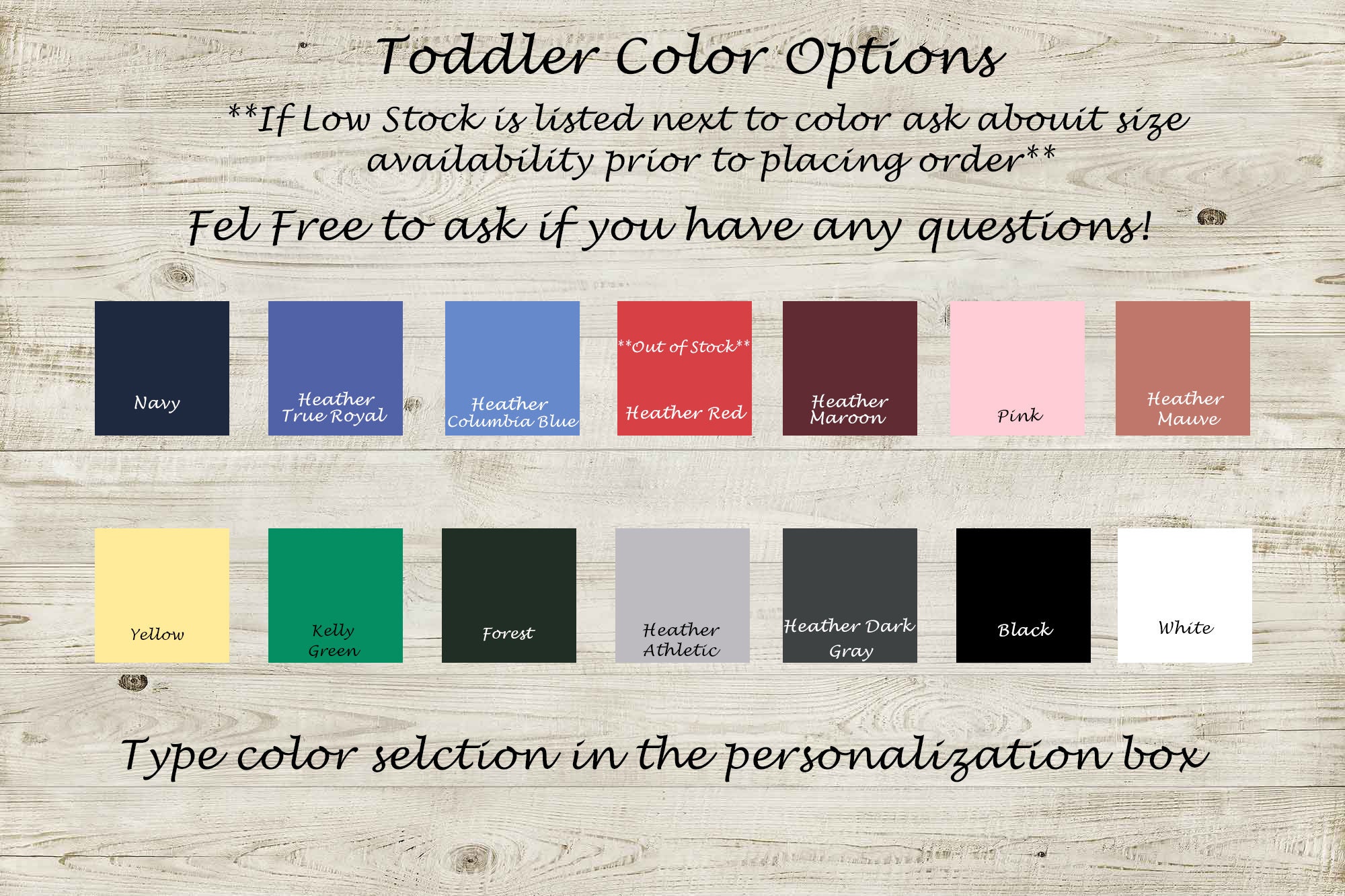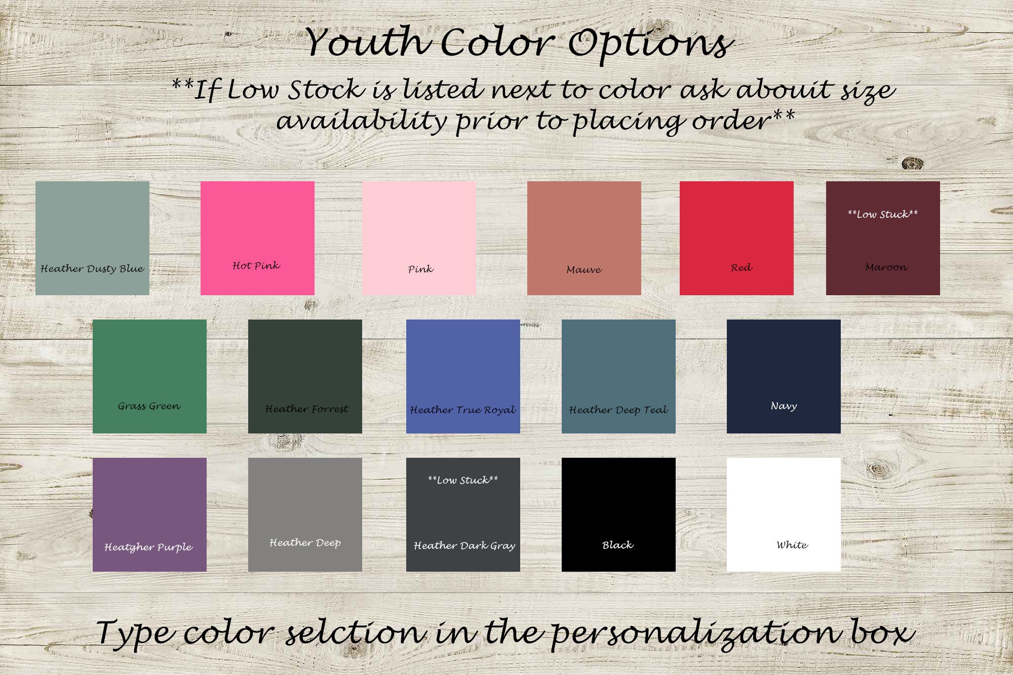 If you want to double check availability feel free to message me! I will also be happy to send you a mockup of your desired shirt color with desired vinyl color before your purchase.