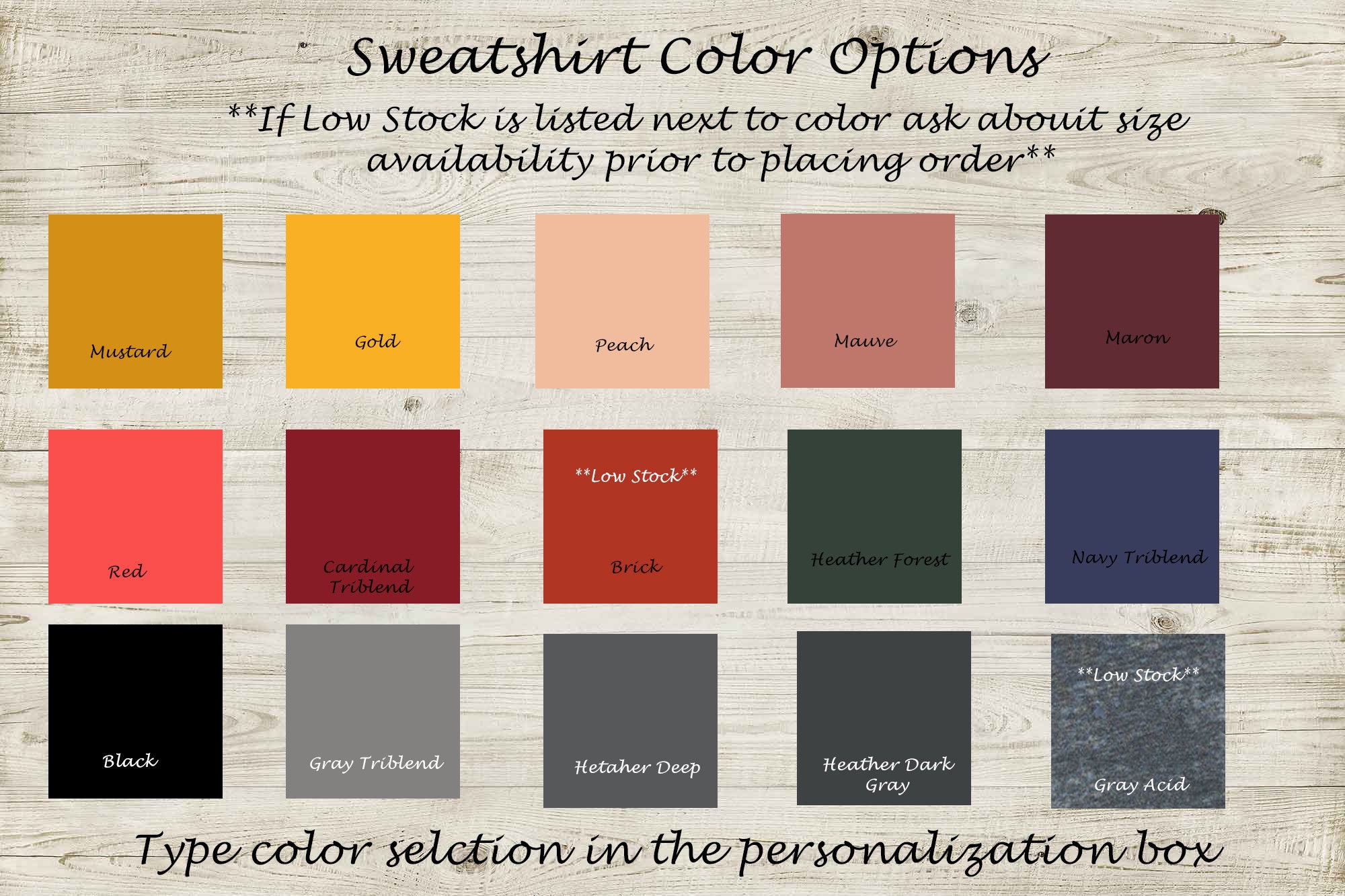 Sweatshirt sizes (Varies depending on availability) XS - 2XL