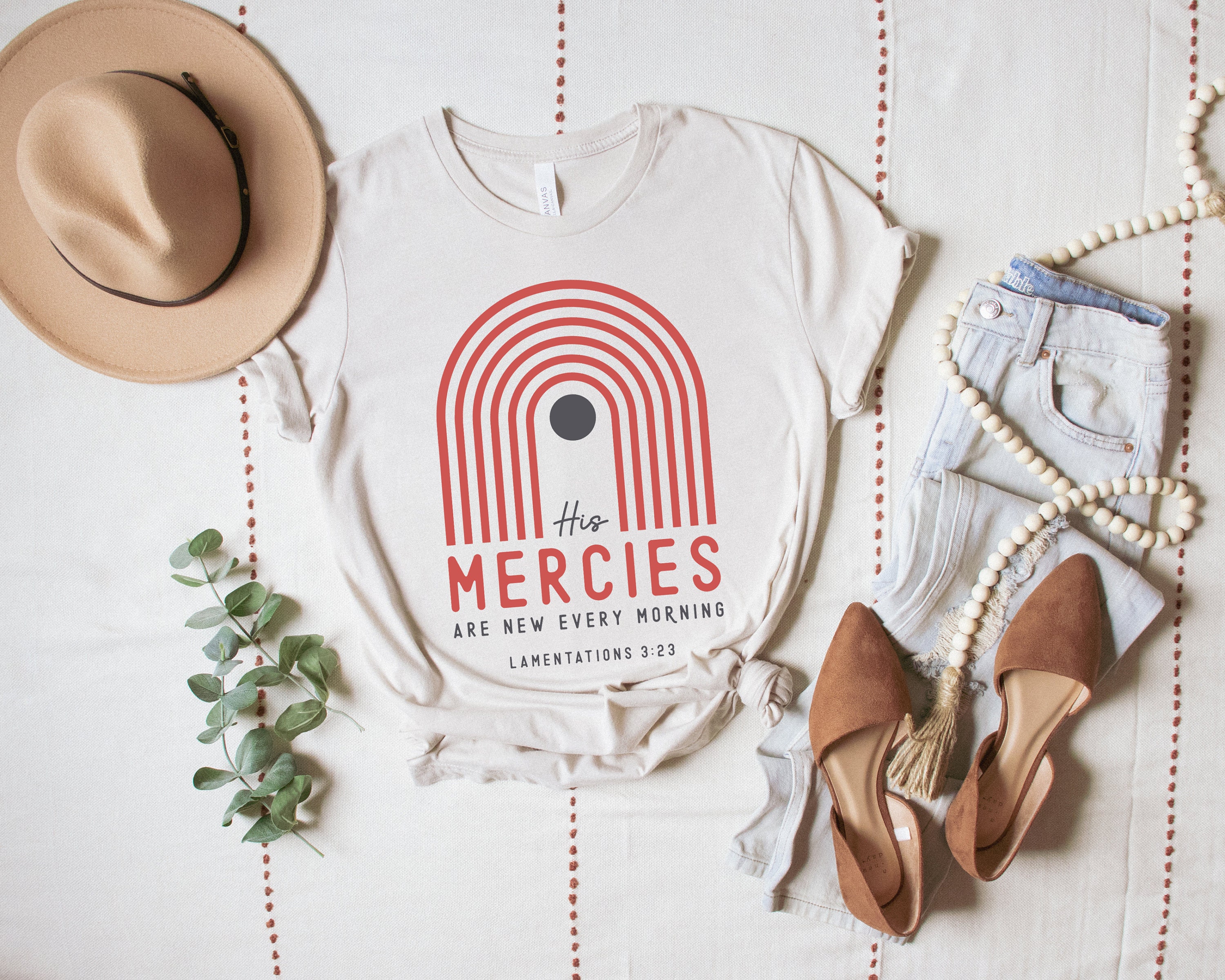 I love this t-shirt because the design is unique, but mostly because of the scripture verse, which is my life verse. It fits great and is good quality. I thought the arches were red but they're more of a light red/deep salmon color, but I still like it a lot and will wear it a lot.