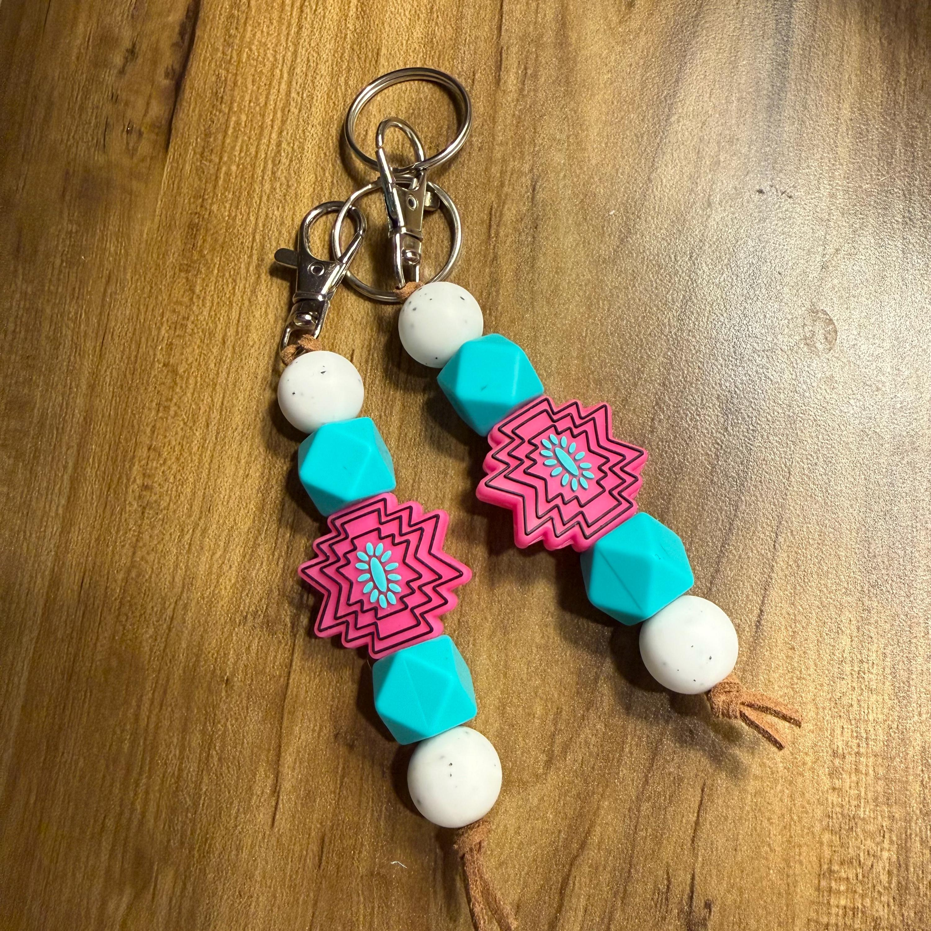 Pink & Turquoise Aztec, Silicone Bead Keychain